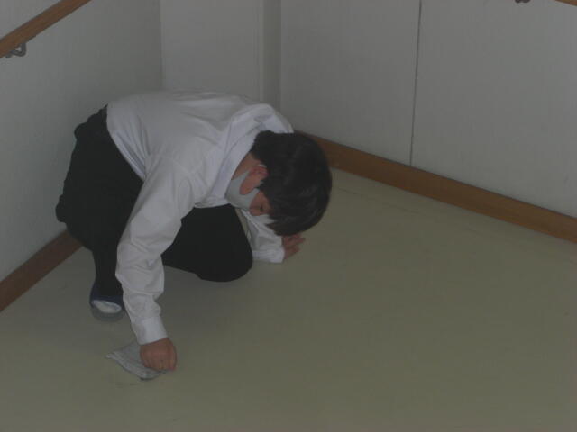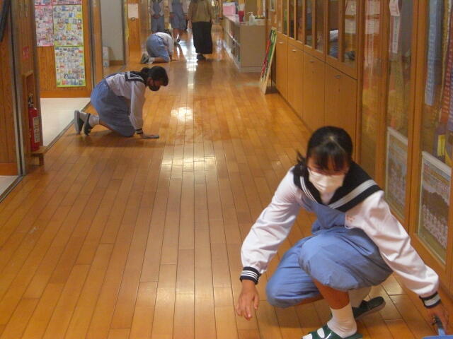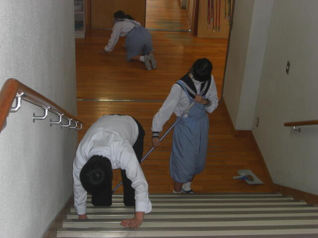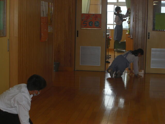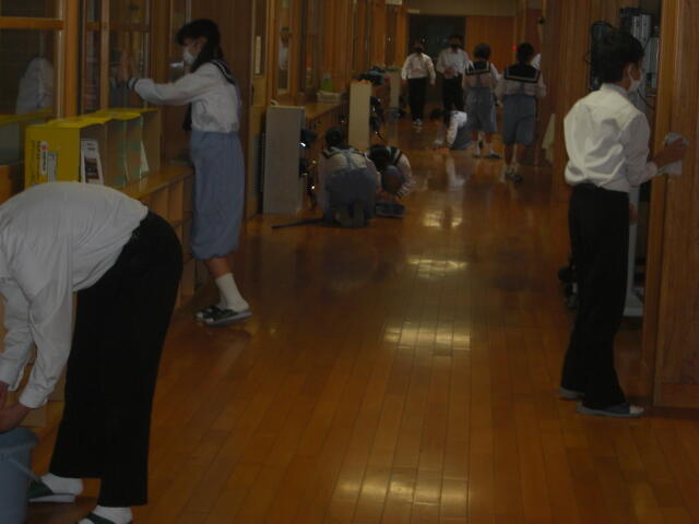 下の写真は、職員室とその周辺の清掃の様子です。いつも清掃開始のチャイムが鳴る前から清掃を始めています。ホウキでで掃いた後、無言で、雑巾がけをしている姿を見ると、あらためて富田中生の良さが実感できます。