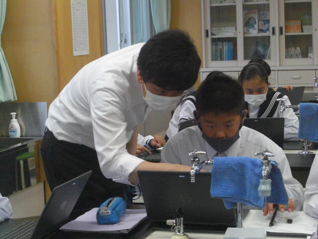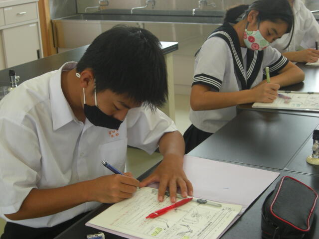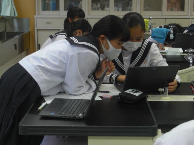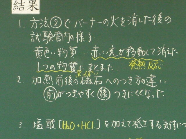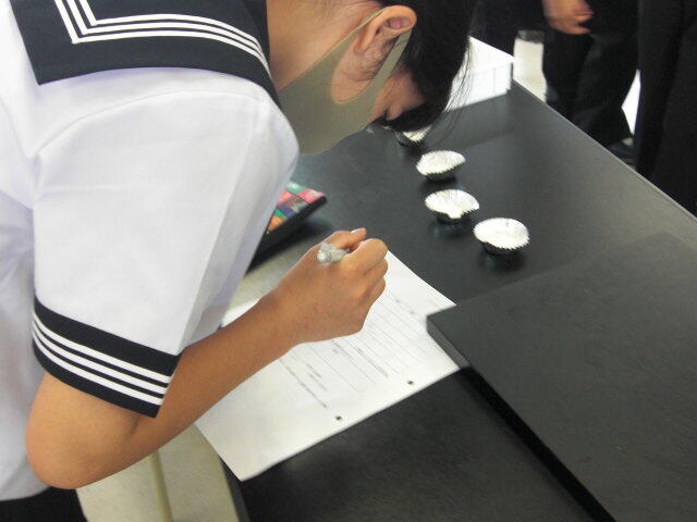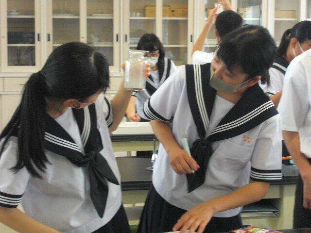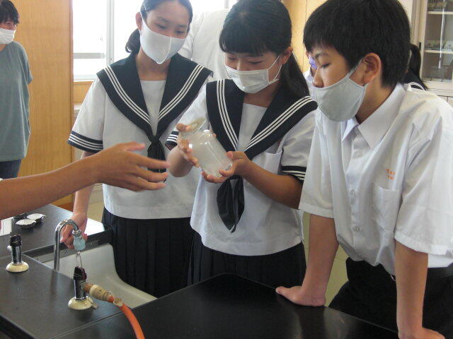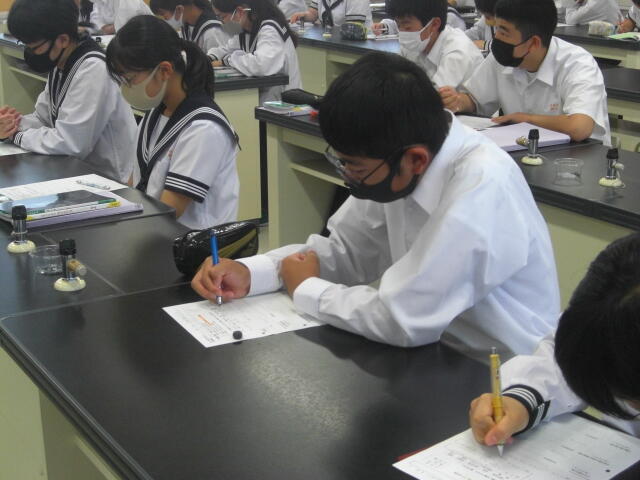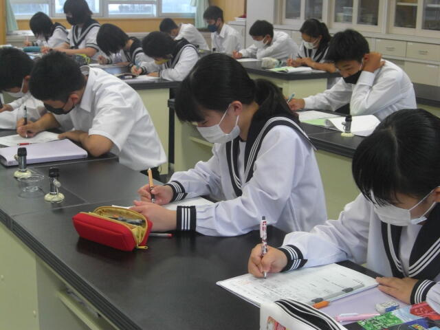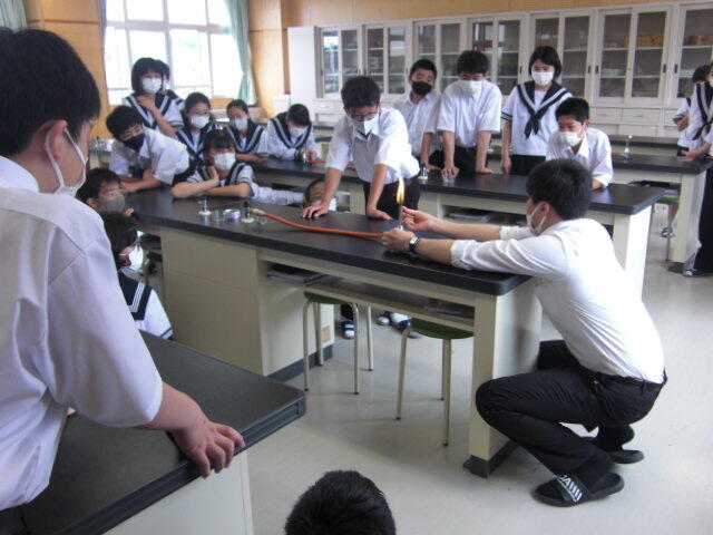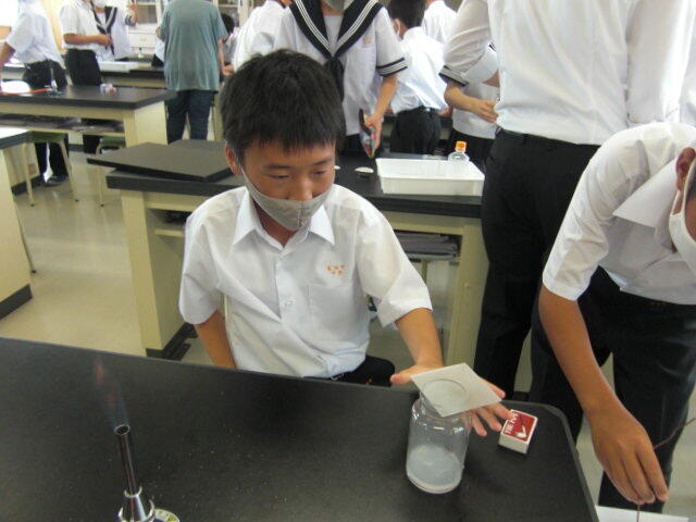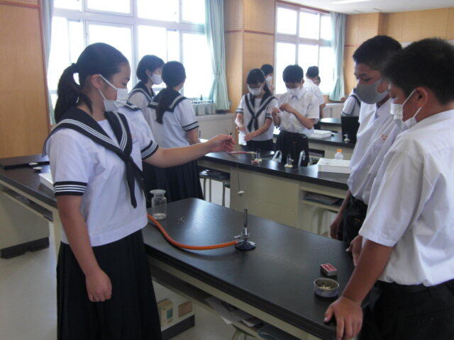 1年生の理科で、ガスバーナーの使い方を練習しました。全体的に上手にマッチの火をつけて、ガスバーナーの操作もスムーズにできました。昨日(7日・月)の午後の1組と2組の授業の様子と、今日の1校時に1組が次の実験に取り組んだ様子です。