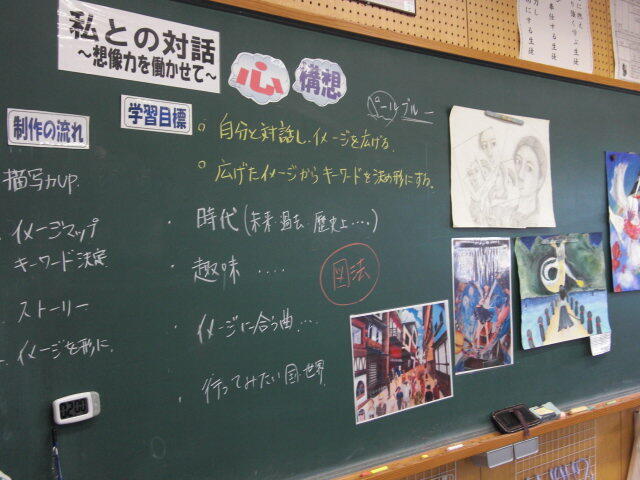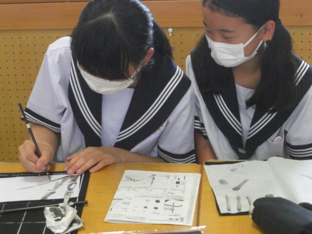8日(火)の3年生美術の授業の様子です。何時間かにわたっての制作ですから、制作の流れを明示することで見通しをもって取り組ませたり、タブレットを活用したりするなど、いろいろな工夫が見られます。