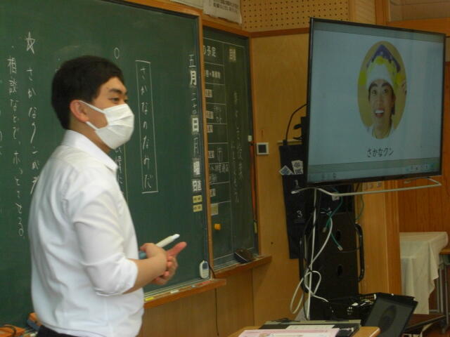 1年生の国語の授業は「書写」でした。子どもたちは「とめ」「はらい」などの筆運びを意識しながら黙々と練習していました。教室の前には大型のテレビが設置してあり、その画面では、筆の運び方を説明する動画が繰り返し流れていました。