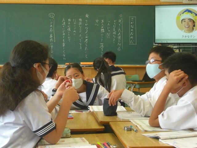 本校の努力事項の1つに「道徳の時間の充実」をあげています。優しい心、善悪の正しい判断力、社会の一員としての在り方など、道徳性を育てる中心となる時間です。今日の4校時は、2・3年生の道徳の時間でした。いろいろな物を準備したり、意見を言いやすい温かい雰囲気をつくったりと担任の工夫も感じられます。