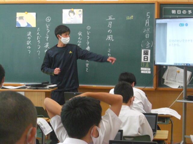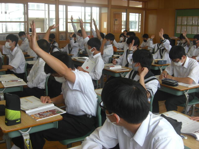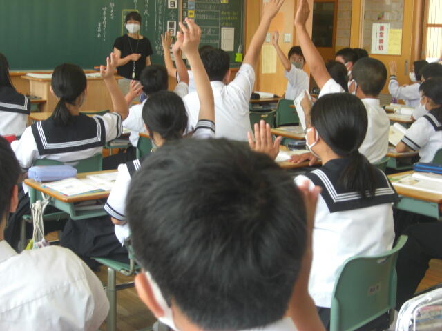 現在の道徳の時間は、学級担任だけではなく副担任も授業を行うことで、多様な指導方法のもとで「生徒が考え、議論する道徳の時間」となることを目指しています。学級担任にとっても、いろいろな指導法を学ぶ機会(職場での学び OJT;On Job Traning)になりますし、ふだんとは異なる立場から生徒に接することで、深く関わったり新たな気付きがあったりするなどの利点があります。本校では、学年職員で相談しながら、副担任による道徳の授業を計画的に行っています。下の写真は、今日の1年1組での授業の様子です。
