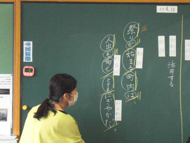 当たり前のことではありますが、英語の授業では英語の文法を覚え、国語では日本語の文法を覚えます。例えば、英語には不定詞が出てきますが、日本語にはありません。頭の中がごちゃごちゃにならないためにも、それぞれの教科の中で「すっきり整理」してあげることが大事かと思います。2年生の国語の板書ですが、参考になりそうです。