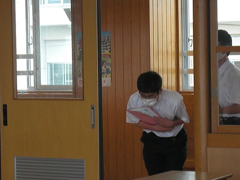 富田中学校の朝は、校歌のオルゴール演奏をバックに行う「朝の黙想」から始まります。全校生徒が立腰の姿勢を取り、心地よい緊張感をもって黙想をしています。