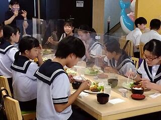 今日の給食はカツカレーでした。3年生の多くが明日、明後日の私立高校入試を受験します。それに合わせて、今日の献立は、受験に「勝つカレー」という意味も込めてあるそうです。3年生もおいしそうに食べていました。