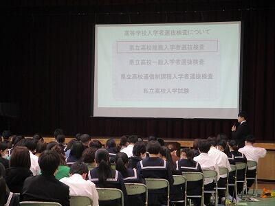 15日(水)に3年生は、高校入試についての説明会を開催しました。この説明会が終わると、いよいよ進路決定の時期になってきます。私立高校の中には、Webでの出願の高校もあり、入試事務への対応も年々変化していきます。各家庭から学校へ提出された書類をもとに、三者面談が行われ、入試事務もスタートすることにもなります。3年生はいよいよ入試モード突入です。