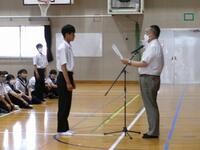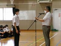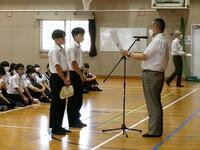 13日(木)に全校集会で表彰をしました。地区中体連総合及びこれまでの大会の表彰でした。また宮崎県で行われる国スポの強化選手に体操競技の生徒が選ばれて認定証を渡しました。