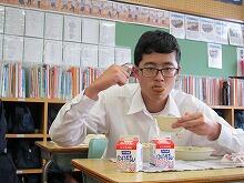 今日の給食はカツカレーでした。3年生の多くが明日、明後日の私立高校入試を受験します。それに合わせて、今日の献立は、受験に「勝つカレー」という意味も込めてあるそうです。3年生もおいしそうに食べていました。