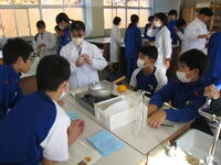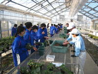 実験室ではクリーンルーム体験とミカンの缶詰づくり、園芸科学を体験した班では、12月に収穫できるイチゴを鉢に植えお土産に一鉢もらいました。