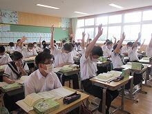 授業中の生徒のようすを見るために校内を回ります。今日は2年生の教室で、担当の発問に対してしっかりと右手を挙げ、発表の意思を示している生徒の姿がありました。中学生になると、手を挙げて発表することが減る傾向があります。特別な授業ではなく、たまたま見学した、いつもどおりの授業で、富田中生徒の積極的に学ぶ姿がうれしくなりました。教科は国語です。
