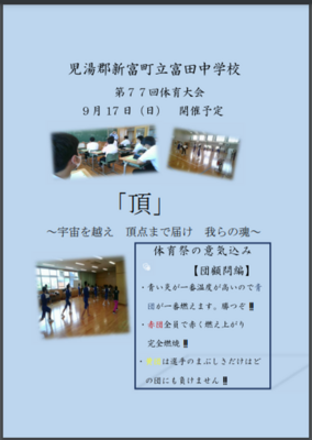 本日(1日)の練習では、団技の選手分けを行い、残りの時間は団ごとに練習をしました。実行委員会が作成した掲示物にも、目がとまる生徒が多くなりました。土日、体を休めておきましょう。