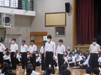 1日(木)に3日(土)から開催される地区中体連総合体育大会の選手推戴式を実施しました。出場するチームからキャプテンが決意を述べました。その後、生徒代表の激励の言葉、校長の激励の言葉、選手宣誓が行われました。日頃の成果が出て、悔いの残らない大会にしてください。声出し応援も可能になりました。応援をよろしくお願いします。
