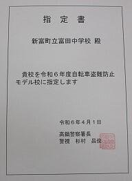 今年度、高鍋警察署管内で「自転車盗難防止モデル校」に富田中学校が認定されました。