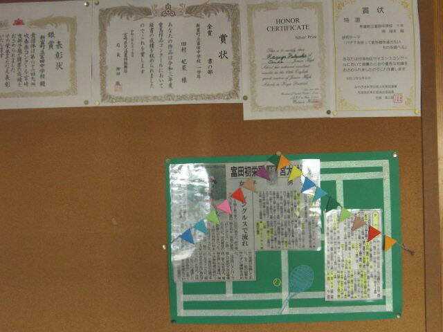 文武両道において、すばらしい成果を収めましたので、賞状や優勝旗がたくさん飾ってあります。賞状は、夏のものから秋のものへと模様替えをしました。9日(木)の参観日など、学校へ来られる際にご覧ください。