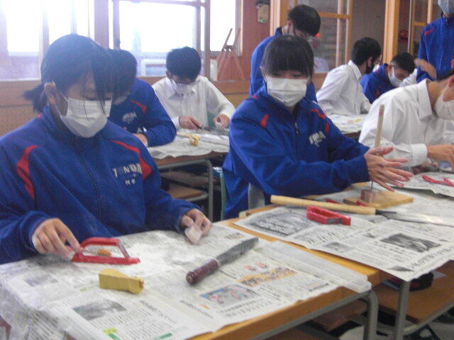 2年生の美術では、粘土で和菓子をつくっています。粘土をこねたり、お菓子らしい形にしたりと楽しそうです。