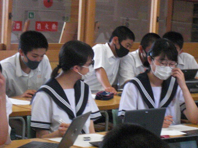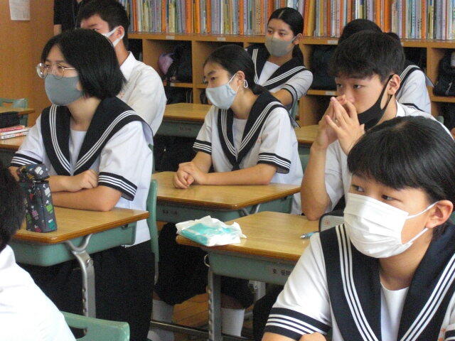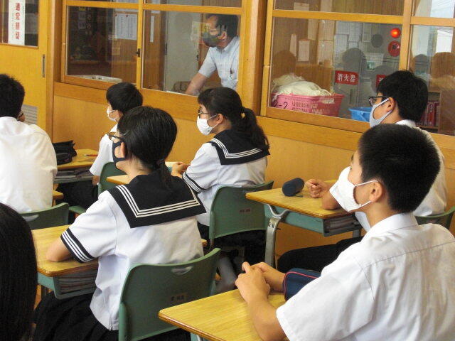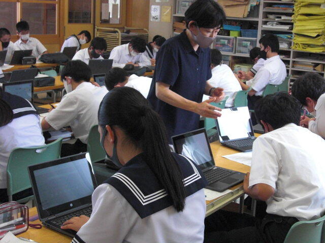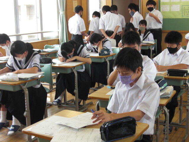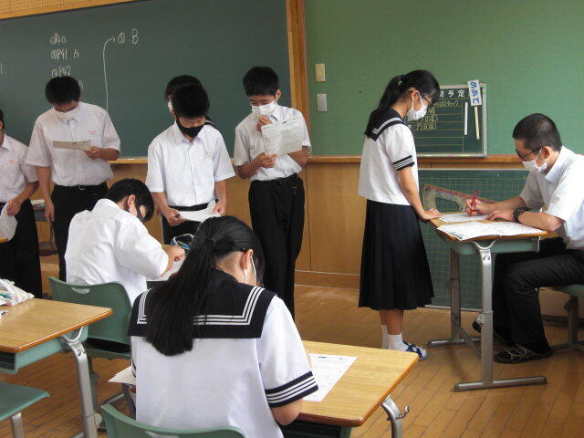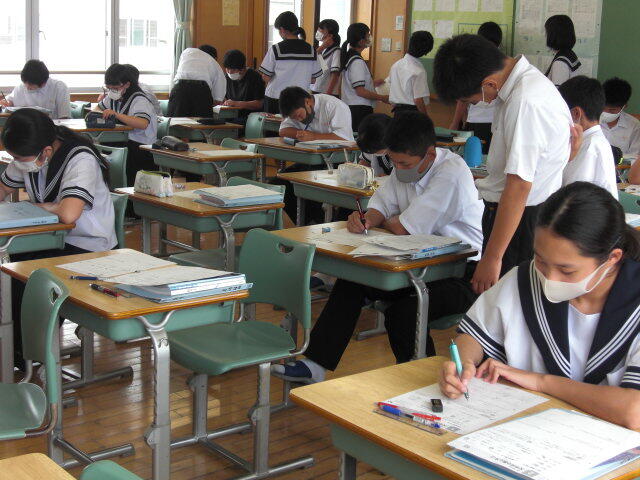 1・2年生は、23日(水)から期末テストですから、1週間前となりました。1年生にとっては、初めての定期テストです。1年3組の数学では、練習問題を速く正しく解くことを目標にして、みんなが一生懸命に問題に向き合っていました。本年度は、町教育委員会から特別支援教育支援員を配置していただいており、都合がつく場合には授業のサポート(ここでは、丸付け)もしてくださっています。