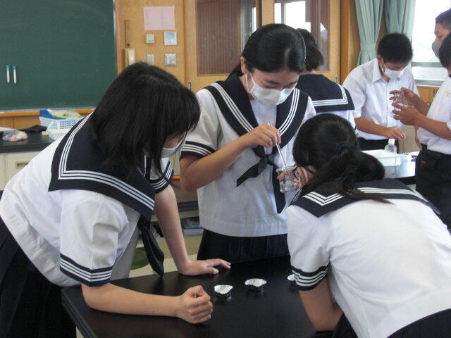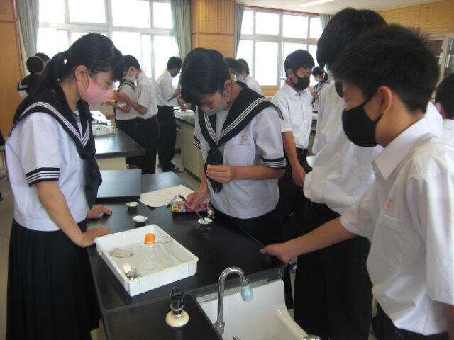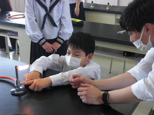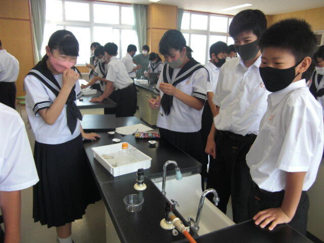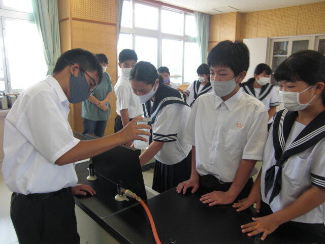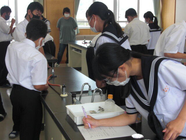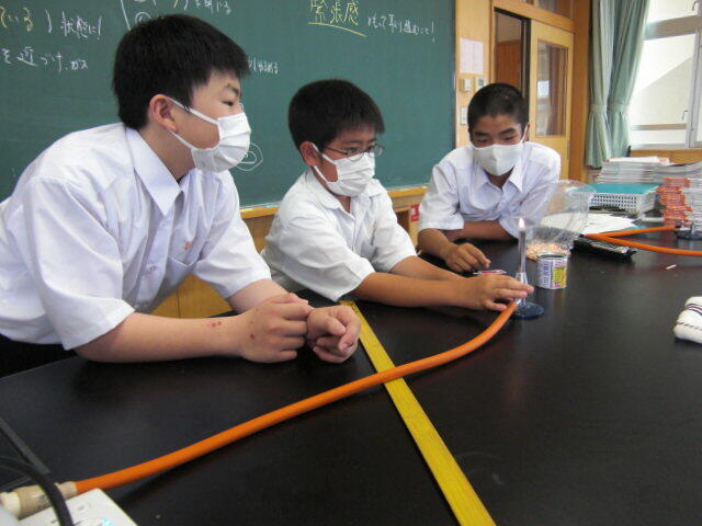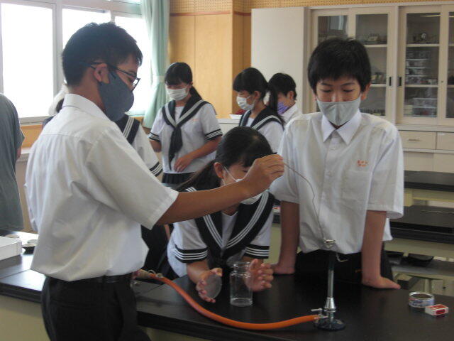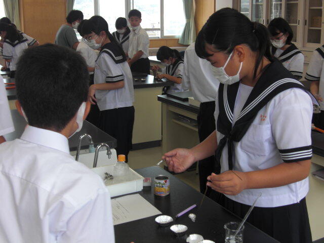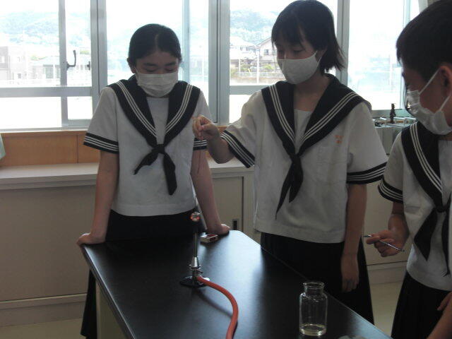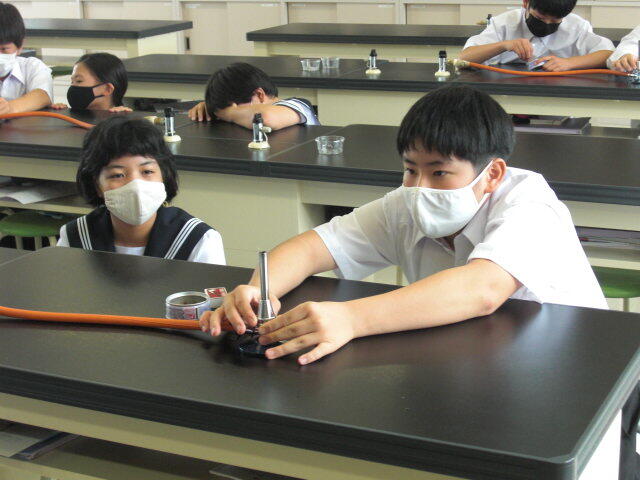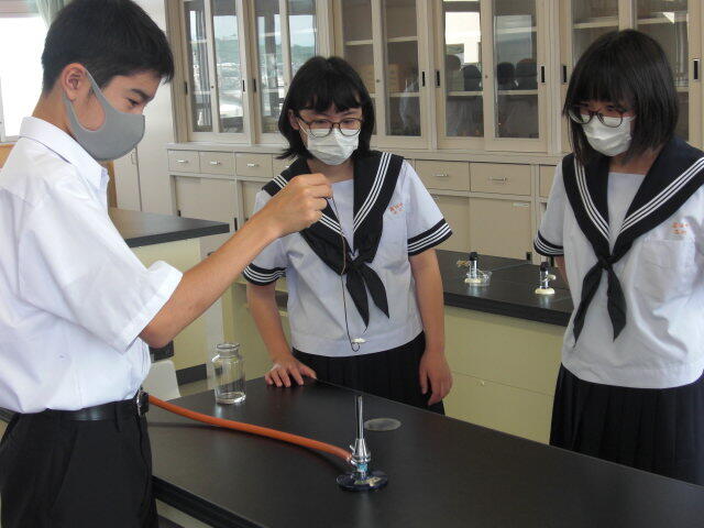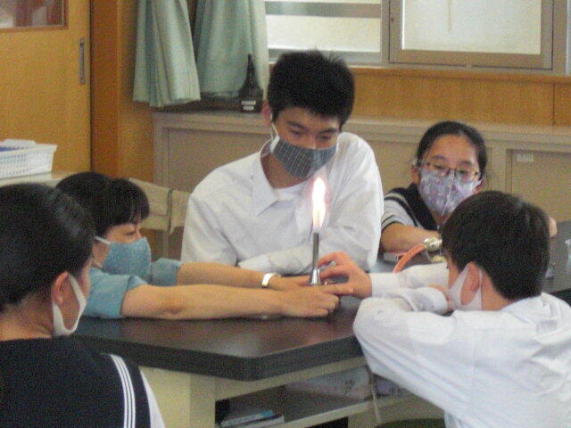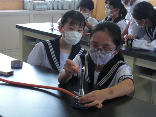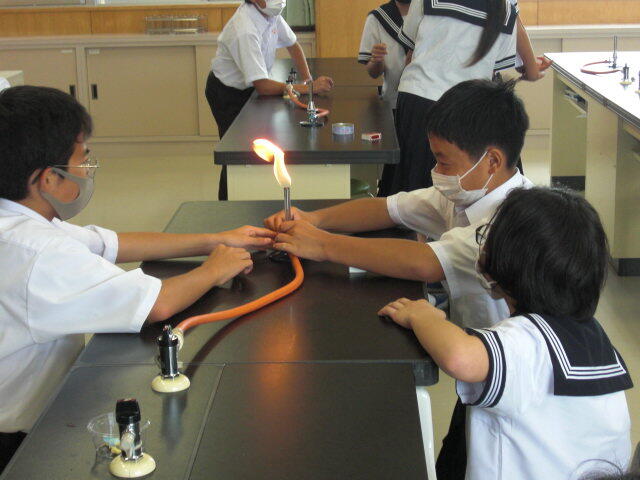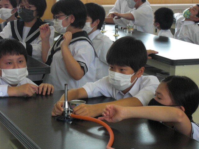 1年生の理科で、ガスバーナーの使い方を練習しました。全体的に上手にマッチの火をつけて、ガスバーナーの操作もスムーズにできました。昨日(7日・月)の午後の1組と2組の授業の様子と、今日の1校時に1組が次の実験に取り組んだ様子です。