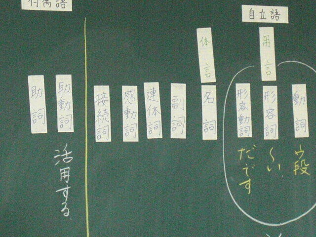 当たり前のことではありますが、英語の授業では英語の文法を覚え、国語では日本語の文法を覚えます。例えば、英語には不定詞が出てきますが、日本語にはありません。頭の中がごちゃごちゃにならないためにも、それぞれの教科の中で「すっきり整理」してあげることが大事かと思います。2年生の国語の板書ですが、参考になりそうです。