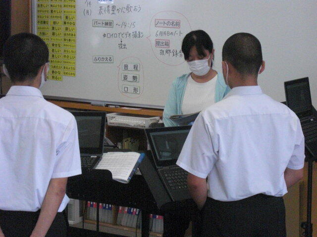 ↓ 再生して自分の歌声を聴いています。     ↓            ↓ みんなで共有できるように