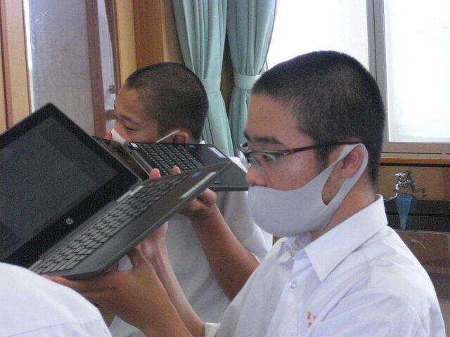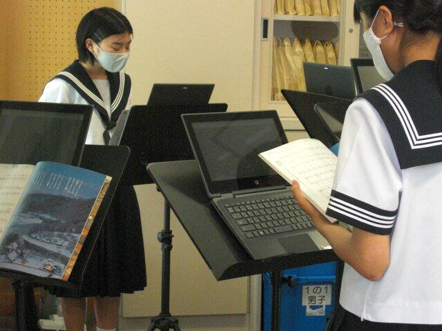 3年生の音楽で、「ふるさと」のパート練習をしています。タブレットのカメラを使って、自分が歌っている姿を見たり、録画・録音をしたりしています。マスクがいらない状態ならば、口の開け方を自分で確認・修正することもできます。録音した歌声は、自分で再生して聴くこともできます。また、指定したところに保存(提出)することで、他のパートの歌声を聴く(共有する)こともできます。