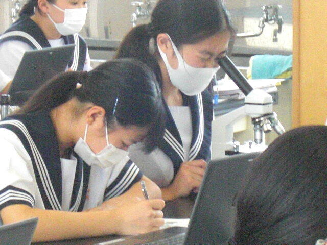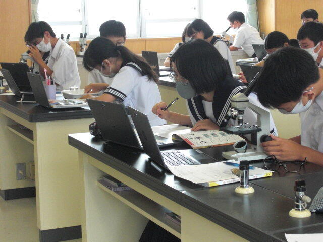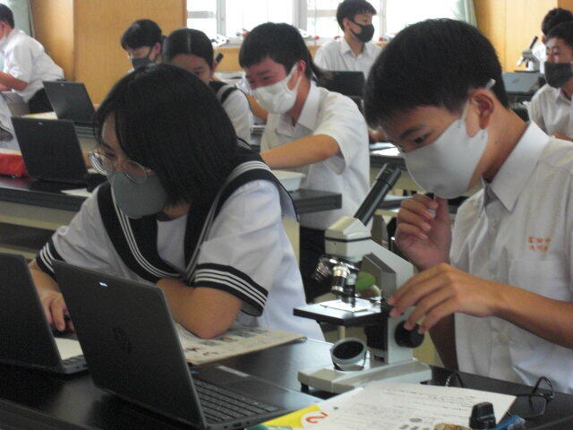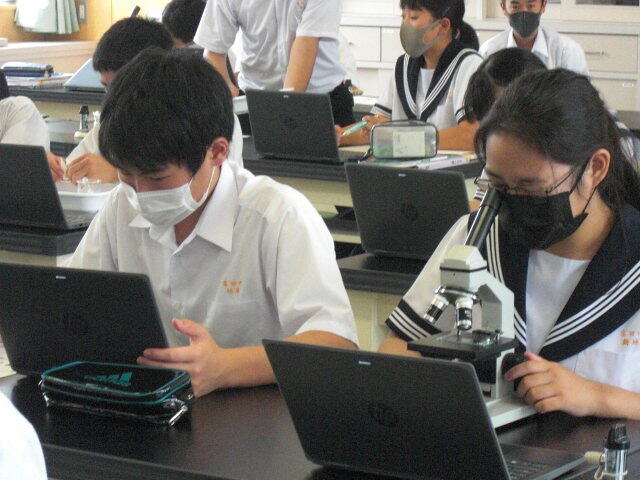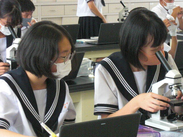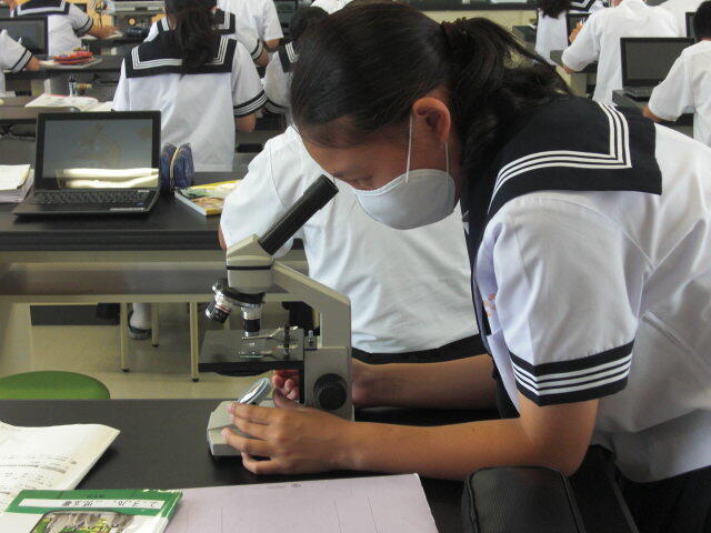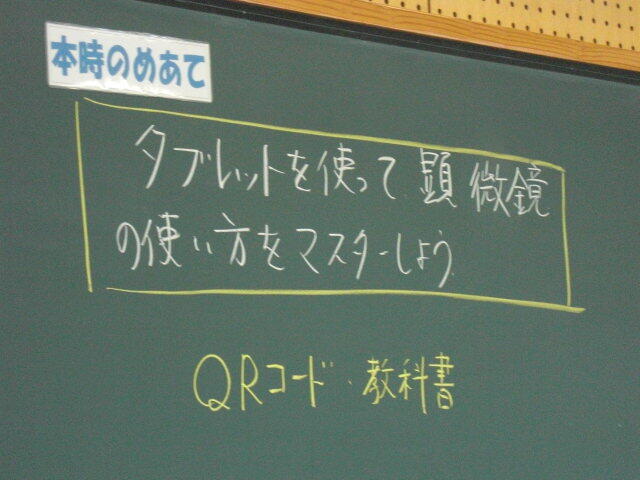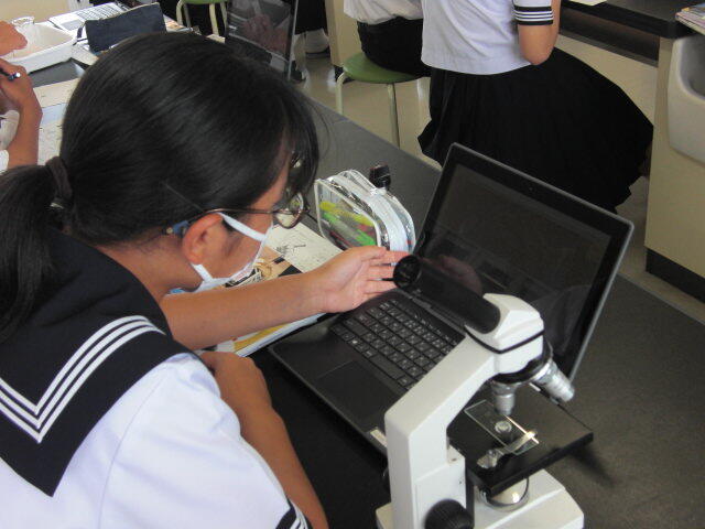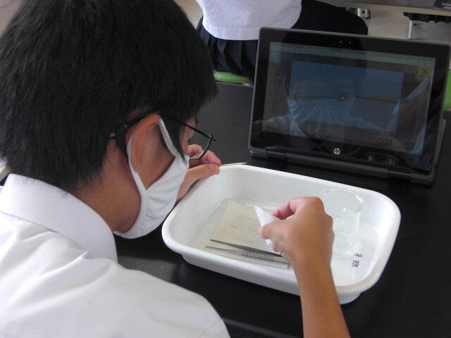 2年生の理科で、顕微鏡の使い方を学習しています。また、顕微鏡で観察するもの(プレパラート)も自分で準備します。タブレットで教科書の出版会社にアクセスすると、使い方やつくり方を説明する動画があるので、それを見ながら聞きながら挑戦します。タブレットの動画が先生役をしてくれますので、自分一人に一人の先生がいるような感じです。授業者は、生徒の中を回って個別指導ができます。わかりにくかったら何度でも繰り返して動画を確認できる点もタブレットのメリットです。