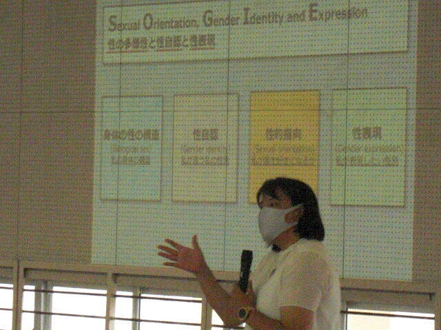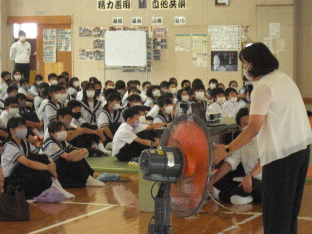 町のご厚意で、順天堂大学スポーツ健康科学部助教の野口亜弥さんにおいでいただき、1・2年生を対象にして「LGBTQ・自分らしく生きること」という演題で講演をしていただきました。野口さんは、プロサッカー選手としてご活躍の後、スポーツ庁国際課勤務等のご経験もある方です。町内の他の中学校にはオンラインで配信されました。
