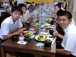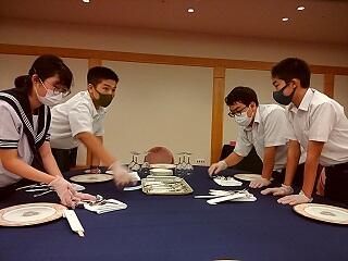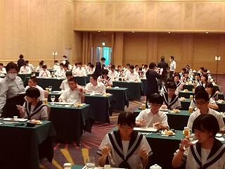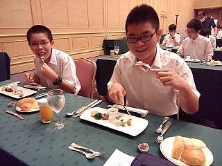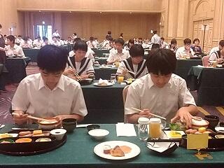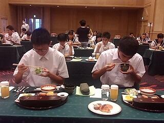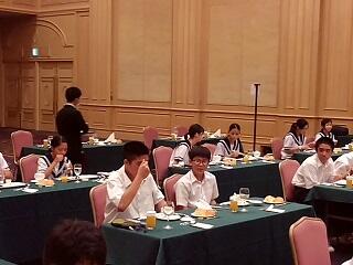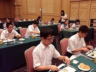 夕食のコース料理の様子が写真で送られてきました。どうぞ、3年生の真剣な顔をご覧ください。