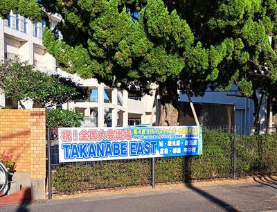 本校3年生の生徒が、1月に東京で開催されるバスケットの全国大会に選手として出場します。その横断幕が本校に届きました。校門前に掲げています。(1週間の予定です)