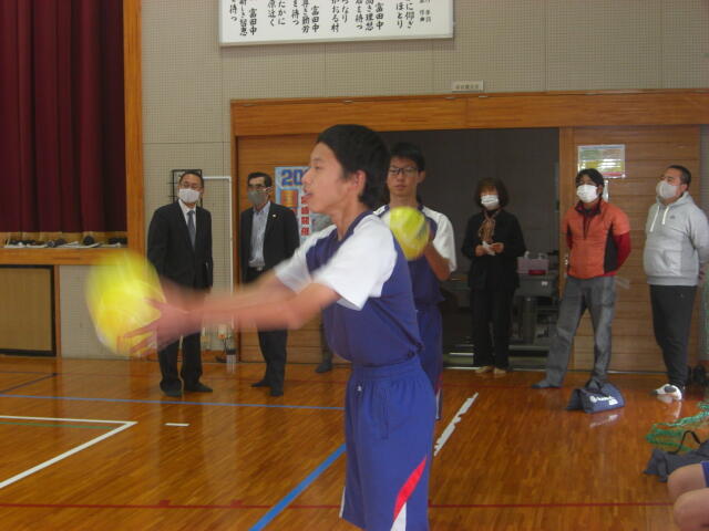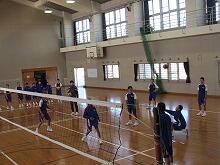 体育の授業でバレーボールが始まりました。写真は1年生の様子です。富田中には男子バレーボール部と女子バレーボール部がありますが、多くの生徒は初めてバレーボールを経験します。今日の授業では、バレーボールに慣れるために、輪になってパスの練習をしたり、ボールを投げ入れてのゲームをしたりしていました。