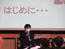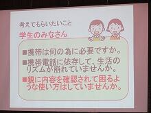 IT企業の専門家の方と警察の方をお迎えして「スマホ・ケータイ安全教室」を行い、専門家の方から、インターネットの特徴や利便性、危険性などの説明がありました。