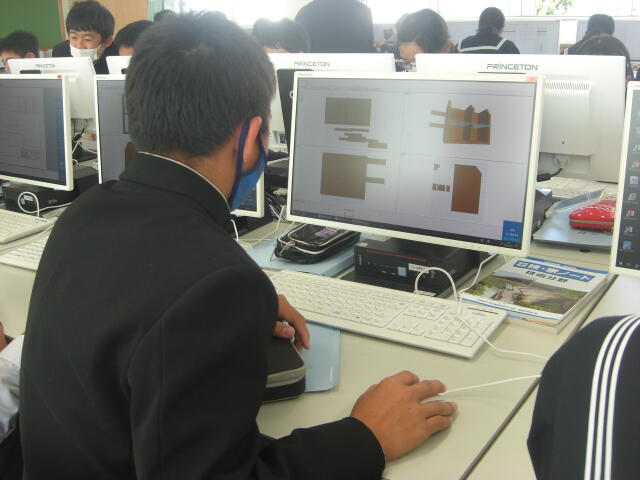 コンピュータを使って製図・設計をしています。ディスプレイに自分が描いた立体図形が表示され、3Dで回転をさせたりもできます。どこかにある設計事務所のような雰囲気でしょうか??