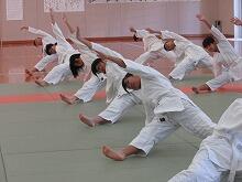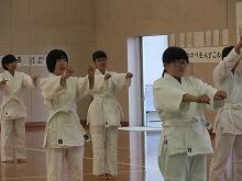 中学校の体育の授業では、相撲、剣道、柔道などの武道を行うことが学習指導要領で定められており、県内では多くの学校が柔道を行っています。授業を見ると、けじめのある授業前後のあいさつや真剣な表情での準備運動、笑顔で受け身などの練習をしている姿が印象的です。