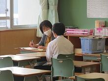 富田中では学期に1回ずつ、全校生徒を対象とした教育相談を行い、生徒の悩みを聞いたり、学習のアドバイスを行ったりしています。相談相手は学級担任にだけではなく、部活動の顧問や自分が得意または苦手な教科担任の時もあります。