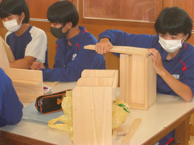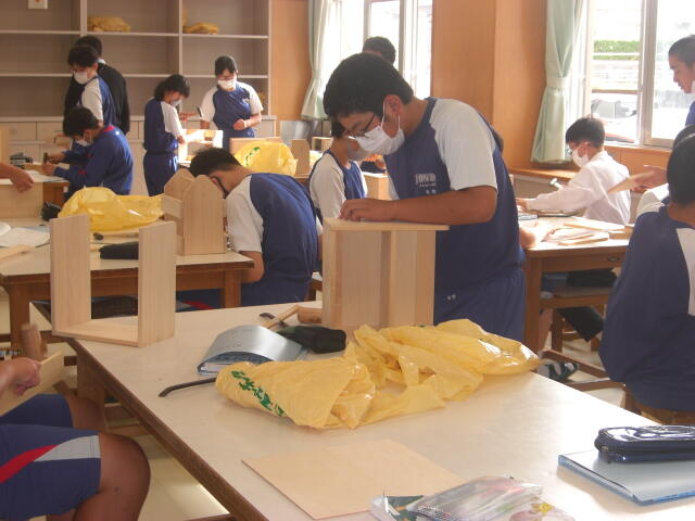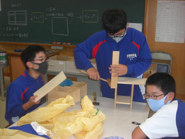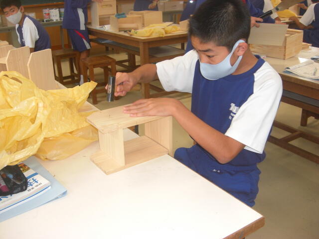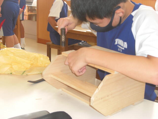 2年生が技術の時間に取り組んでいる木材加工、完成間近です。あとは、家に持って帰る日をお楽しみに。