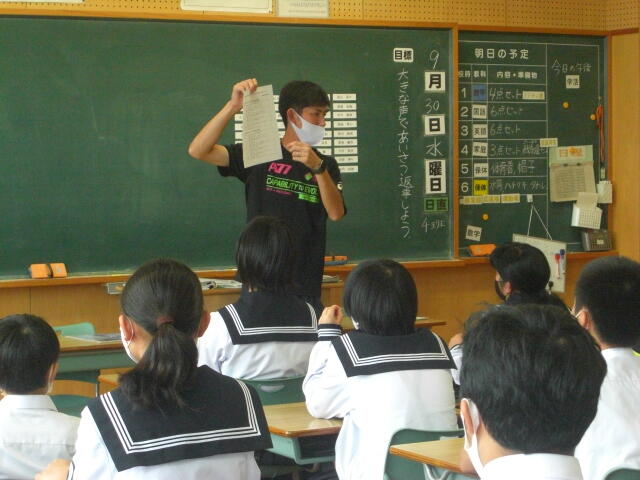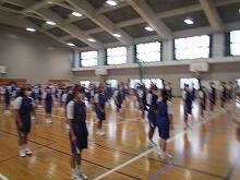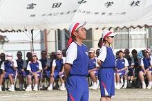 富田中学校の体育大会は10月11日(日曜日)に行います。今日は2回目の全校体育でした。しかしあいにくの雨のため、団ごとに体育館と武道場に分かれて、集団行動の練習と開・閉会式の確認をしました。青団、赤団どちらの団も団長・副団長・リーダーを中心に自分たちで声を掛け合い、練習を進めていました。