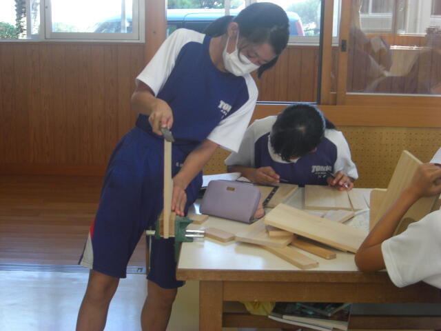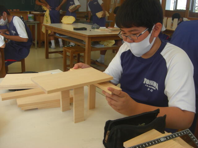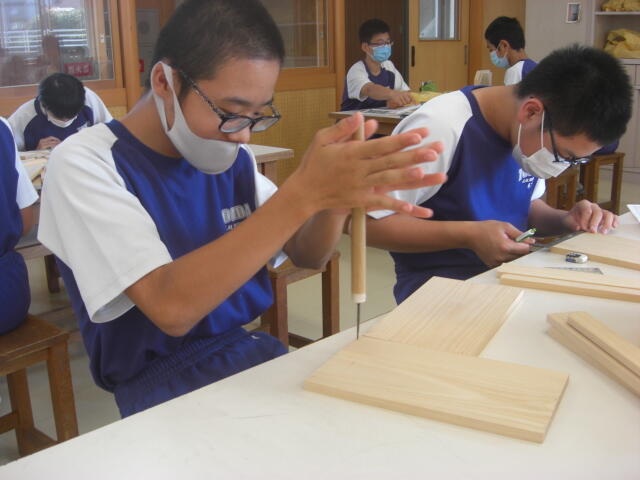 2年生技術の作品制作が続いています。1週間に1時間程度の授業ですので、作業はゆっくりと進み、今は板を切ったり穴を空けたりする段階のようです。
