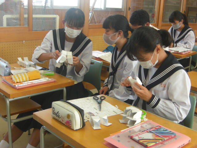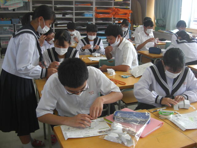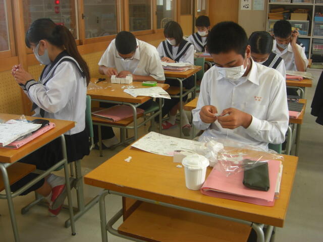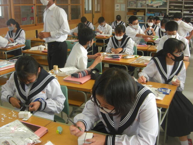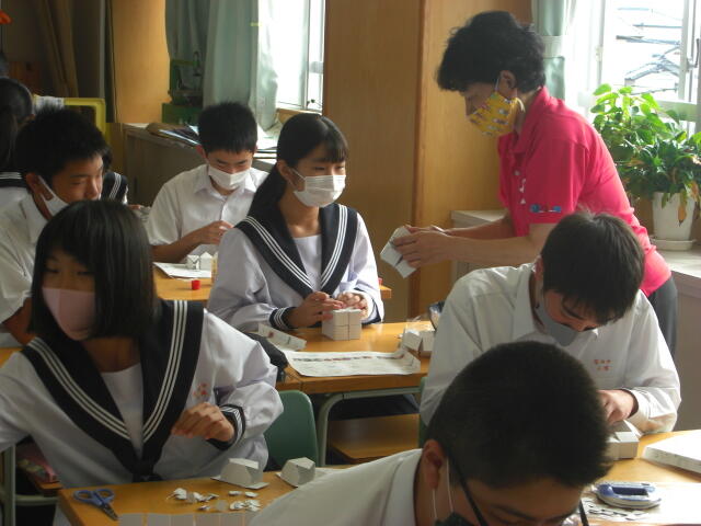内容的には、動画を見たり教科書を読んだりすることで終わらせることが多い単元ですが、ちょっとした工夫で生徒が興味を持ち、目を輝かせる時間でした。学級担任の先生も今日の授業内容を事前に聞き、熱中している生徒の写真を撮っていました。