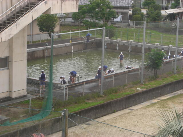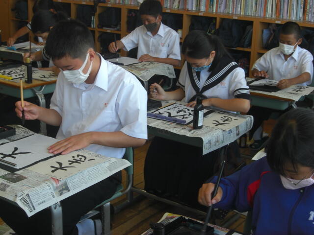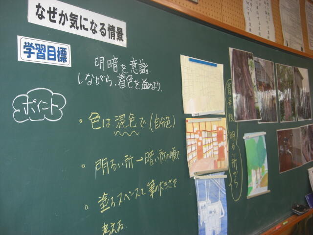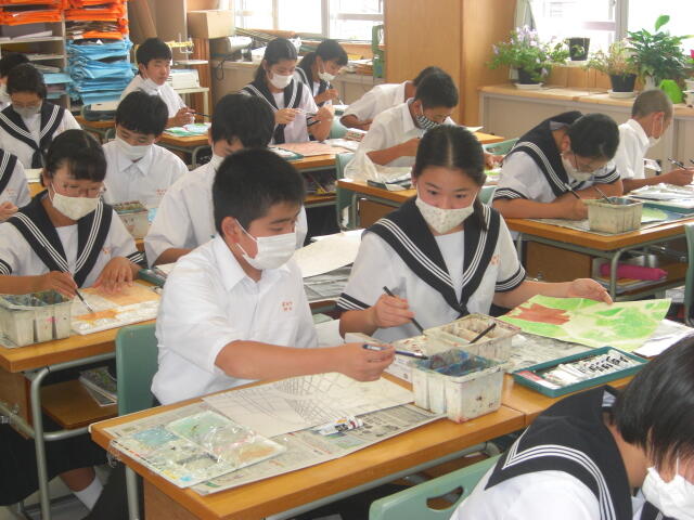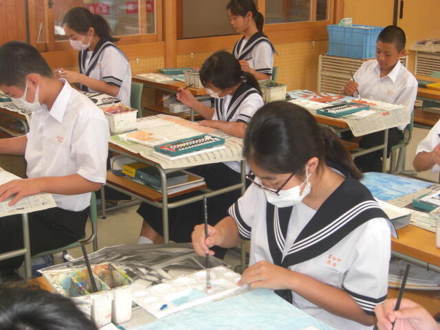 水泳に備えてプール掃除が行われています。2校時は、2年2組と5組の生徒が一生懸命に掃除をしていました。高圧洗浄機も使いつつ少しずつきれいになります。美術室では、1年1組が「なぜか気になる情景」を描いていました。「どうして?何が?気になったのか」興味をそそられ、聴いてみたいところでしたが授業中ですので・・・。
