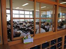 今回の参観日は、いわゆる「3密」を避けるために、学年毎に時間をずらし、体育館や武道場などの広い教室で学級懇談を行いました。また、授業は廊下から、時間を制限しながらの参観でした。