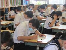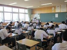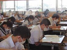今日と明日、3年生は地区の実力テスト受けます。今回は、志望校・学科別の順位も出ます。今日は国語、理科、英語のテストがあり、登校後から教室で熱心に勉強している生徒もいました。明日は社会と数学のテストがあります。