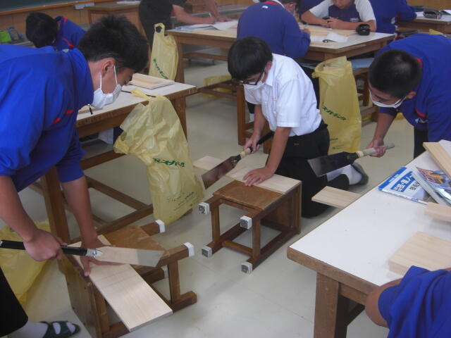 2年生が技術で木材加工の実習をしていました。のこぎりで切る作業に取りかかった生徒もいます。何ができるか、これからも楽しみです。