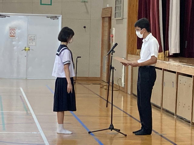 12月23日(金)に第2学期終業式を行いました。1学年代表 鶴田絆さん、2学年代表 長友羽奏さん、3学年代表 坂本裕さん、生徒会代表 黒木一花さんが、2学期の行事を振り返りながら発表しました。式後に各種表彰を行いました。また、学習面、生活面、健康面で、この冬休みに注意しておくこと、新年に向けて取り組んでおくことを確認しました。