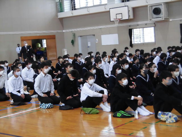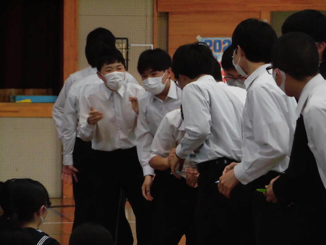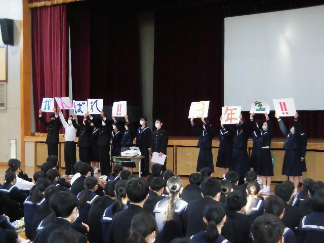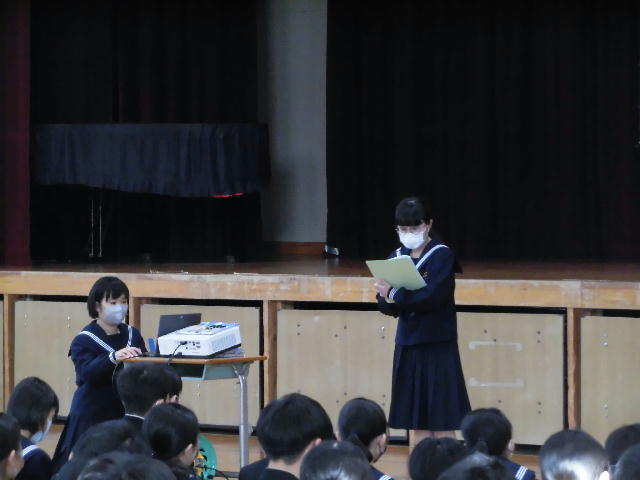 1月24日生徒集会を行いました。給食感謝の取組など、本年度第4期の生徒会活動の説明のあとに、3年生への激励を行いました。最後に、1月29日の ムーブメント・アート・インみやざき2023 第13回スクールダンスコンテスト に出場する1年生9名の演技披露がありました。当日の大会では、第2位に相当する「宮崎県女子体育連盟賞」を受賞しました。