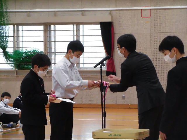 2月7日に生徒表彰を行いました。総合人材情報サービス会社アイデム(東京都)が主催する写真コンテスト「はたらくすがた」の中学生の部で全国グランプリを受賞していた藤江みずきさんは、このたび「県学生栄誉賞」を受賞しました。今後とも生徒の皆さんのいろいろな分野への挑戦を期待しています。j最後に、九州教職員卓球大会で優勝した戸髙九州男先生の表彰も行いました。