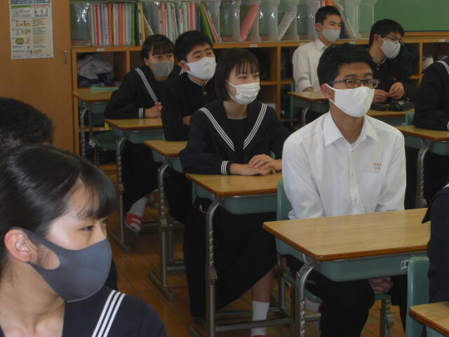 今日から3学期が始まりました。始業式を放送で行い、各学年と生徒会執行部それぞれの代表生徒が新年の抱負を発表しました。その後、校長先生の話がありました。新型コロナウイルス感染防止のため、全校生徒が体育館に集まっての始業式ではありませんが、教室では、静かに放送を聞いていました。