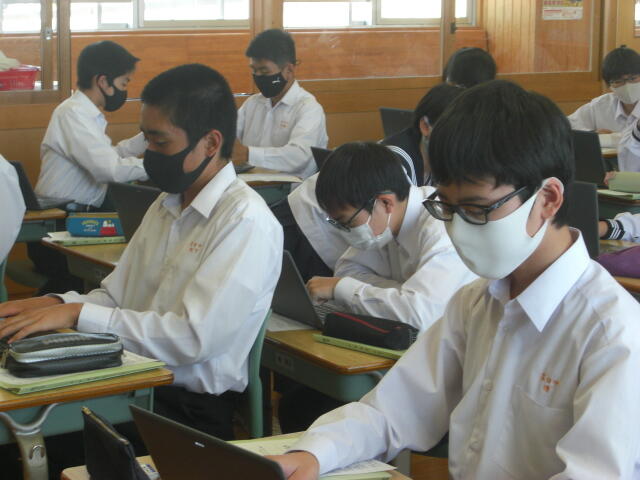 3年生は、タブレット上で先生や生徒同士が会話などをできる機能(チームス)が使えるように、セッティングと試運転を行いました。予期せぬハプニングが起こって試行錯誤という場面もあります。そこで教え合いが生まれたり、得意な生徒が推測しながら解決してくれて活躍したりと、思わぬ効果も生まれました。タブレット活用も少しずつ前進しています。
