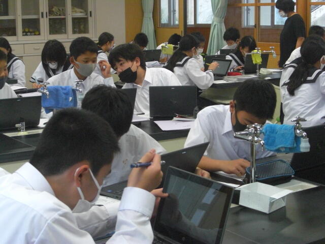 1年生の理科で、ガスバーナーの使い方を練習しました。全体的に上手にマッチの火をつけて、ガスバーナーの操作もスムーズにできました。昨日(7日・月)の午後の1組と2組の授業の様子と、今日の1校時に1組が次の実験に取り組んだ様子です。
