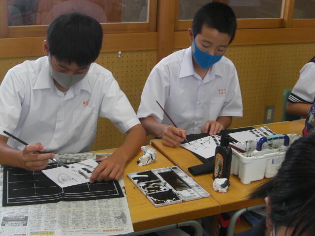 8日(火)の3年生美術の授業の様子です。何時間かにわたっての制作ですから、制作の流れを明示することで見通しをもって取り組ませたり、タブレットを活用したりするなど、いろいろな工夫が見られます。