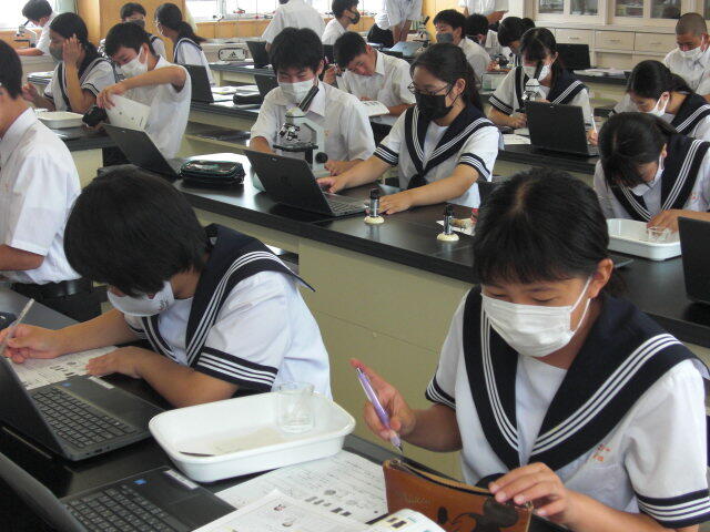 2年生の理科で、顕微鏡の使い方を学習しています。また、顕微鏡で観察するもの(プレパラート)も自分で準備します。タブレットで教科書の出版会社にアクセスすると、使い方やつくり方を説明する動画があるので、それを見ながら聞きながら挑戦します。タブレットの動画が先生役をしてくれますので、自分一人に一人の先生がいるような感じです。授業者は、生徒の中を回って個別指導ができます。わかりにくかったら何度でも繰り返して動画を確認できる点もタブレットのメリットです。