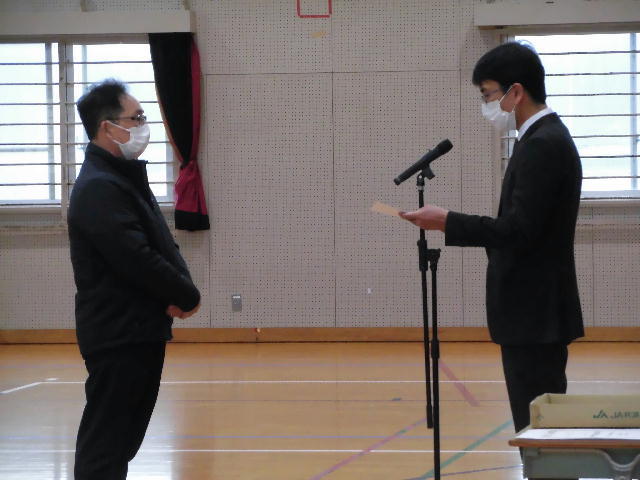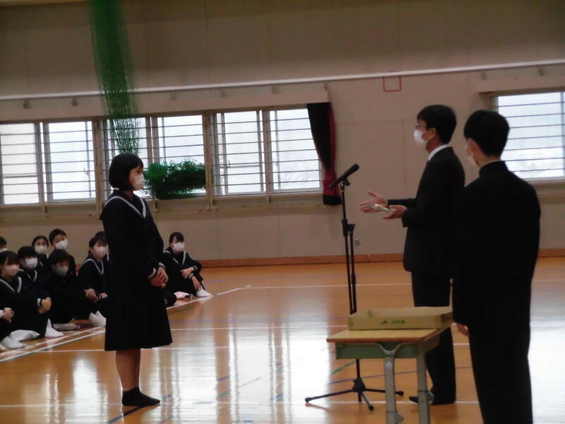 2月7日に生徒表彰を行いました。総合人材情報サービス会社アイデム(東京都)が主催する写真コンテスト「はたらくすがた」の中学生の部で全国グランプリを受賞していた藤江みずきさんは、このたび「県学生栄誉賞」を受賞しました。今後とも生徒の皆さんのいろいろな分野への挑戦を期待しています。j最後に、九州教職員卓球大会で優勝した戸髙九州男先生の表彰も行いました。